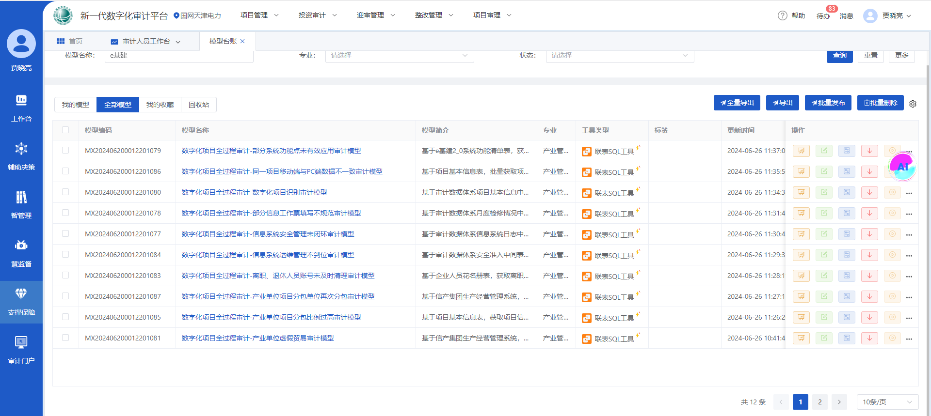 进入审计实施阶段,依托数字化审计平台联表分析工具及审计数据体系,构建购销业务不合规、数字化项目管理体制机制不完善、离职退休人员账号未及时清理、信息系统安全管理未闭环、数字化项目识别、违规分包、隐性债务等12大审计主题模型,实现相关审查点全覆盖审计,同时通过平台数据自动调度功能,数据实时更新,实现数字化项目全流程审计问题实时监督预警。