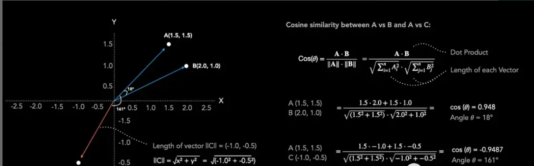 余弦相似度算法解析:余弦相似度(cos (θ))值范围从-1(不相似)到+1(非常相似)。从下图可以看出,点A(1.5,1.5)和点B(2.0, 1.0)在二维嵌入空间中距离很近。当计算余弦相似度时,得到0.948的值也可以确认两个向量非常相似。当较点A(1.5,1.5)和点C(-1.0, -0.5)的相似度时,余弦相似度为-0.948,表明两个向量不相似。通过观察也可以看到它们在嵌入空间中方向相反。cos(θ)值为0表示两个向量彼此垂直,既不相似也不不同。